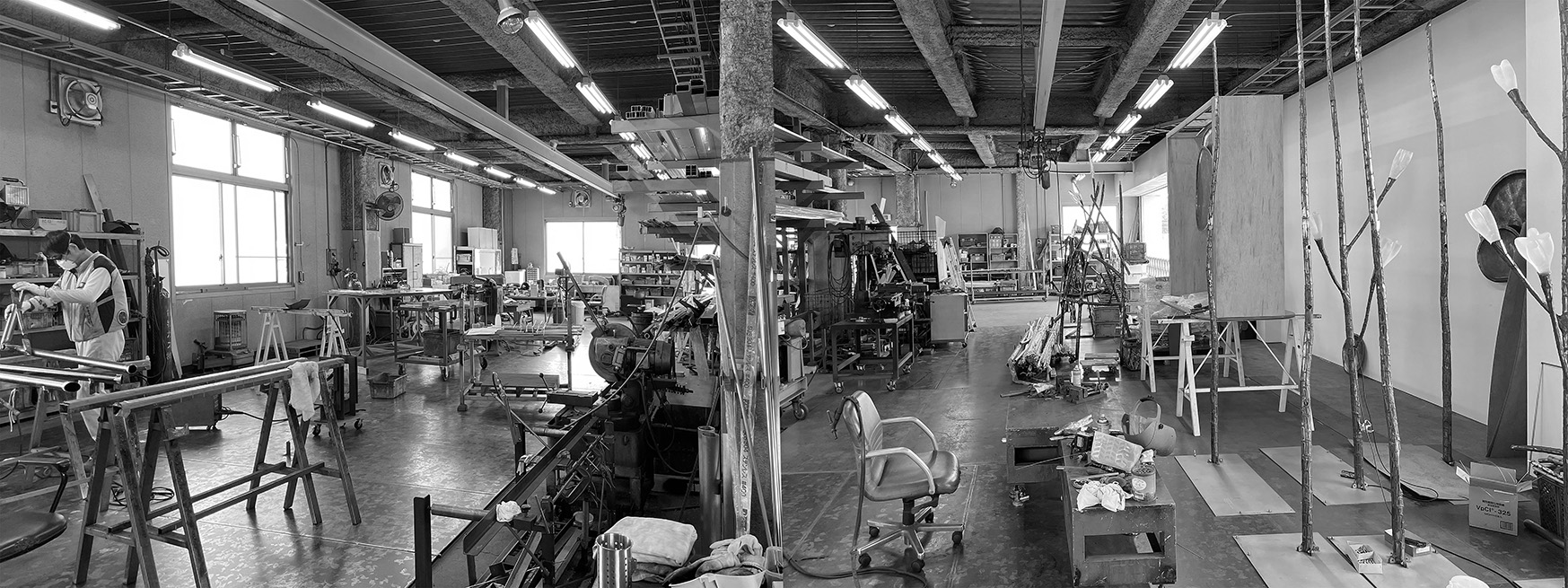 TAP Factoryでは、長年にわたって培われた溶接技術、加工技術、小ロット生産力を基盤に、屋外彫刻から店舗装飾什器にいたるまで幅広い作品の製作を手がけます。木材、ガラス、金属などさまざまな専門分野のパートナーと協力し、各分野で蓄積された技術を集約するハブとして高度な要求にも柔軟に対応。デザイナーや建築家、美術家などのブレーンとともに、企画提案から設計、製作、設置、そしてメンテナンス提案までのワンストップソリューションを提供します。