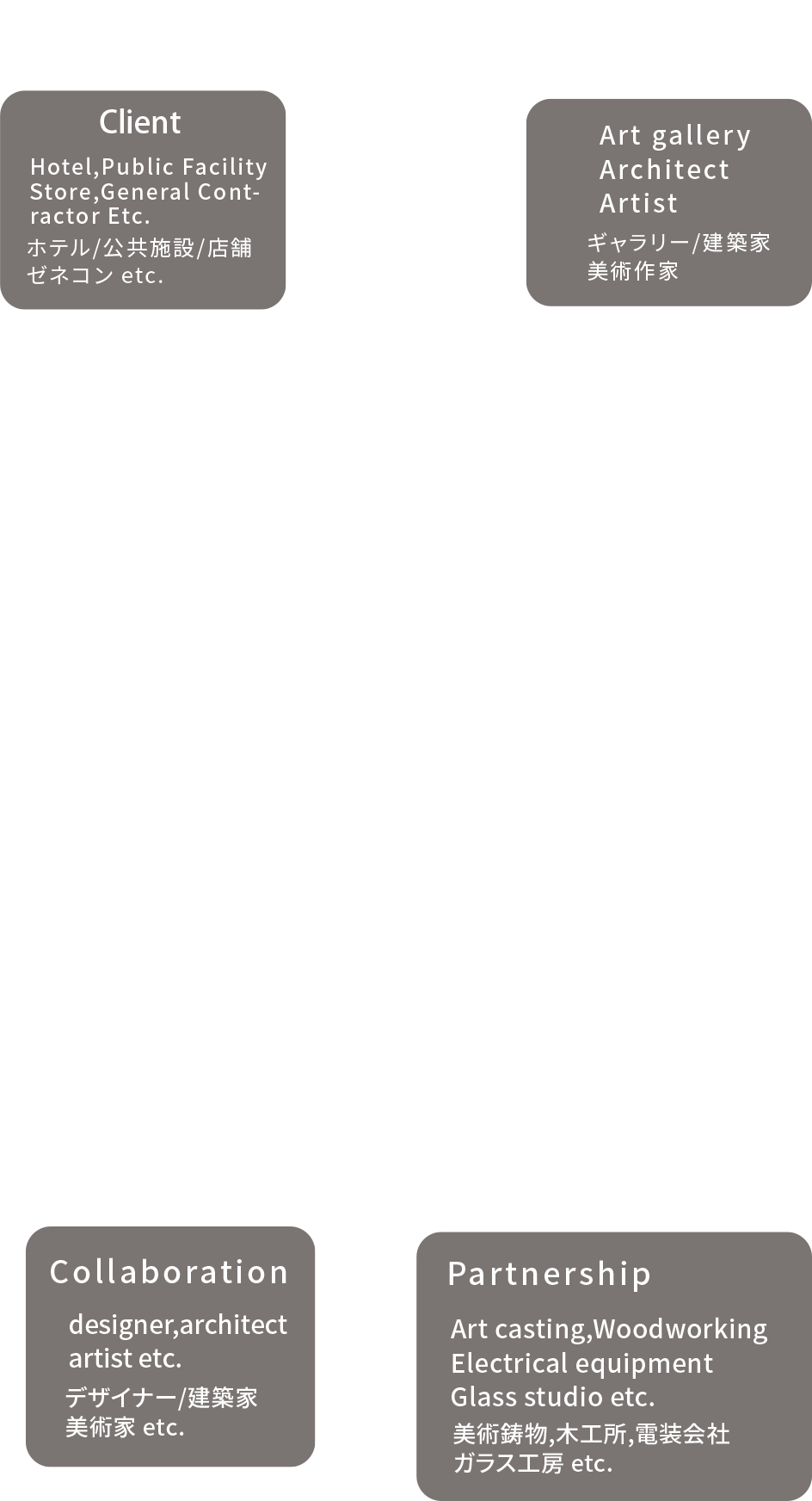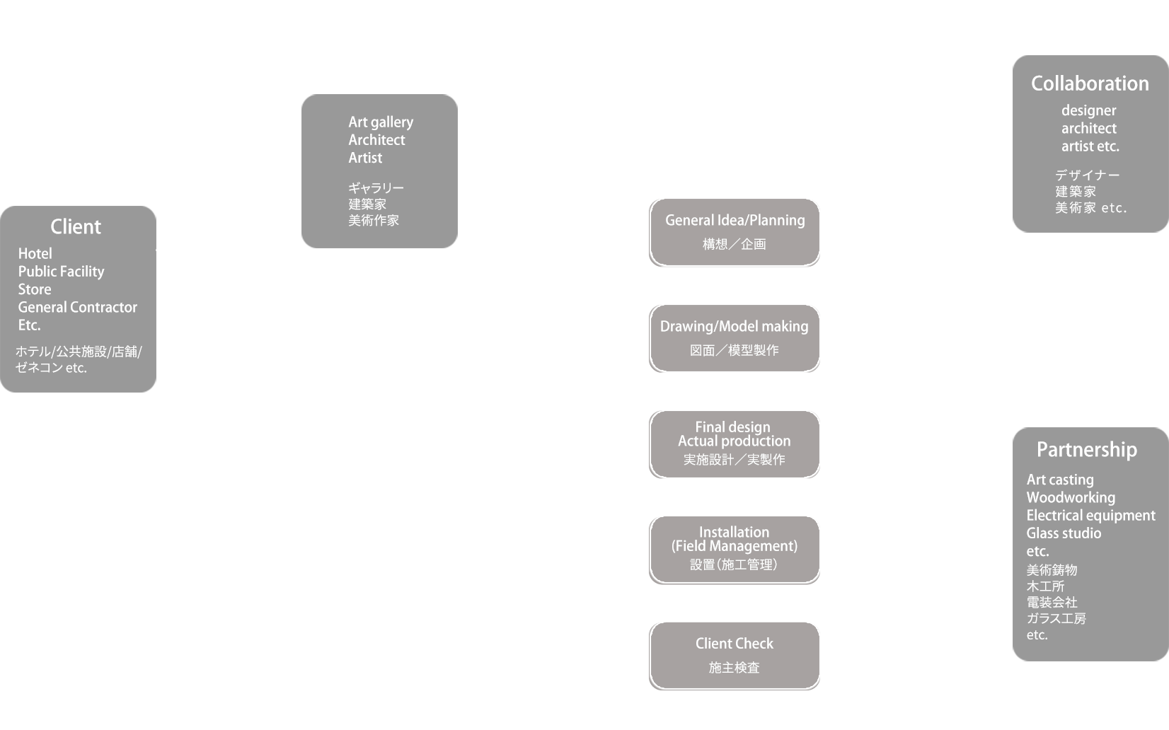 製作は過程のすべてを<TAP Factory>が行うワンストップシステムです。まず、ギャラリーやエージェント、建築家、美術作家より製作を受注。ブレーンであるデザイナー、建築家、美術家とともに、アイデアや要望を反映した企画構想を打ち立てて提案します。プラン決定後は技術パートナーである工房や製作会社とともに図面や模型の製作から実製作へと移行。完成作品の施工設置、クライアントチェックを経て、メンテナンス提案とともに最終引き渡しとなります。