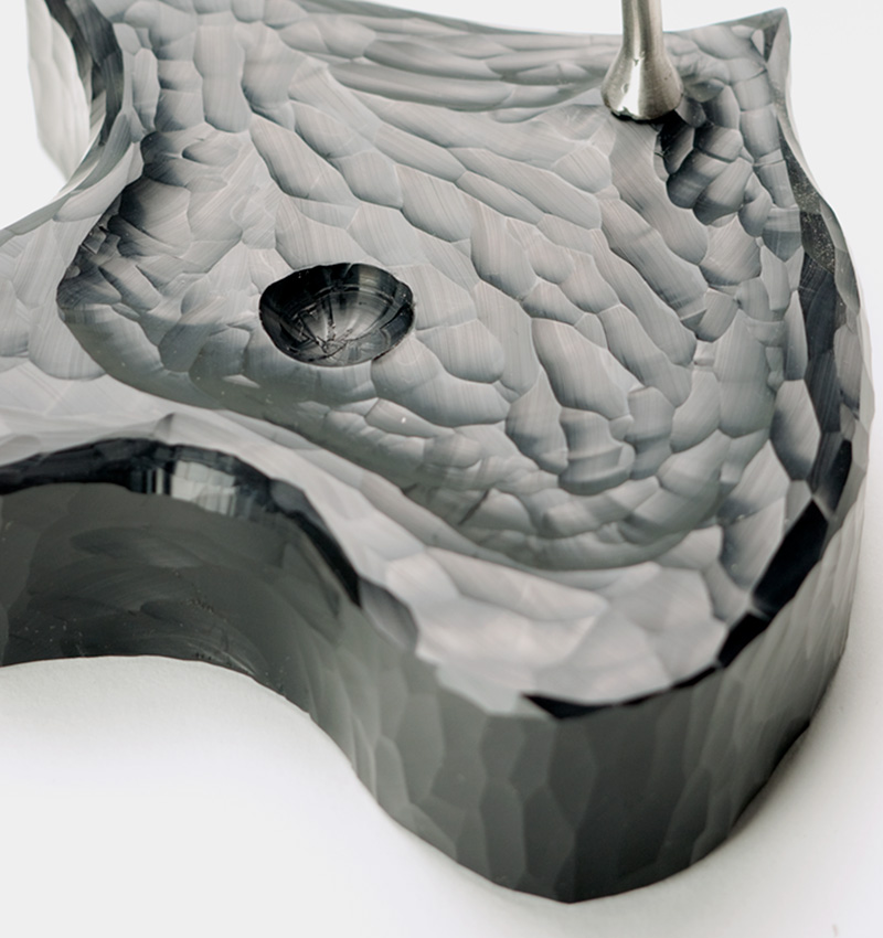 芽を出したばかりのような、ひょろりとしたステンレス製の双葉が傘を受け止める仕様で極力存在感のないオーガニックデザイン。単独では一見オブジェとしか認識できない傘立てになっています。水受け部分は汚れや耐水性に最も優れた超高分子ポリエチレンに、手彫りのテクスチャーを加え不思議な存在感を演出しています。