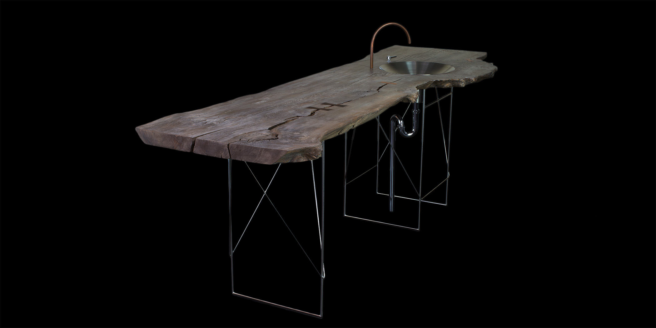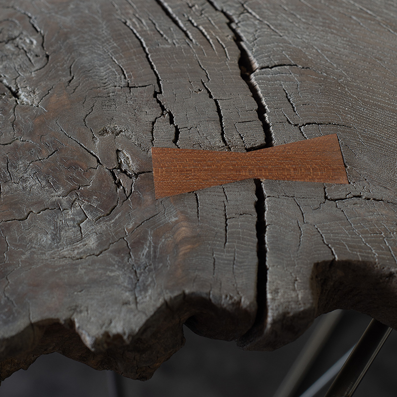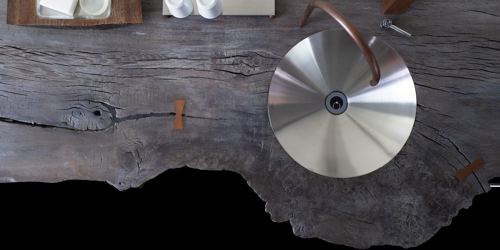 収納機能を無くすと?という発想から生み出された洗面台です。彫刻のような佇まいが生まれ、そこに最小限の機能だけが付帯されたような異質な趣になっています。反り返ったタモ古材に高周波プレス加工を施し、風雨に晒された自然の風合いを最大限に活かしつつ、洗面台としての清潔さを保てるよう古材を研磨後、染色、オイルフィニッシュを繰り返し行います。タルク(ベビーパウダーの主原料)とオイルフィニッシュで仕上げ研磨、蜜蝋ワックスでの撥水と艶出しという工程を経て、古材の時を経た荒々しさを残しながら清潔感を保てるよう表面加工しています。