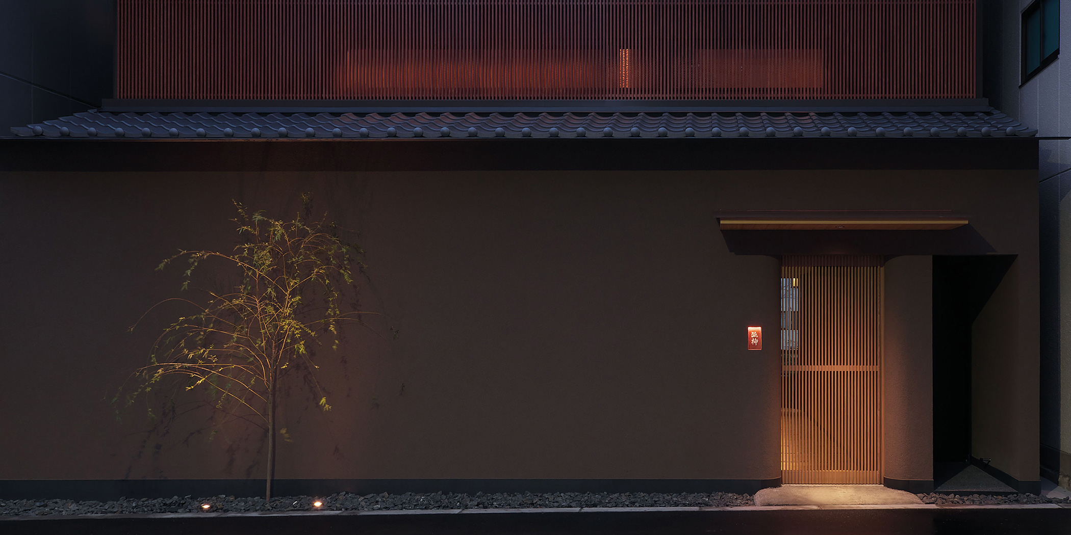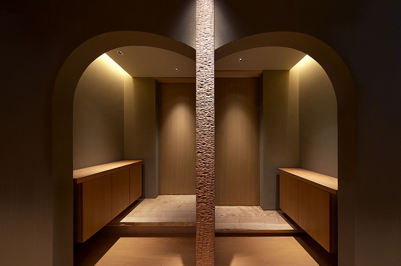 蹲は能勢石を切り出し、正面に自然の風合いを活かしながら滴る水が時を経て苔むす美しさを演出し滴る水は給水管からLEDに直接照らされ天井に水の波紋を映し出す設計になっています。