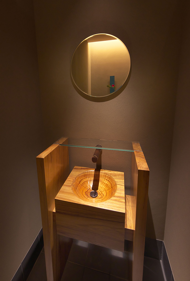 洗面台には、最も水に強い素材として知られているチークの無垢材を使用し、手彫りで洗面ボウルを制作し、丸彫りのノミ跡が自然な水の流れを生み出します。仕上げの塗装は硬質ウレタン樹脂で仕上げられており、十分な強度を保つ事が出来ます。