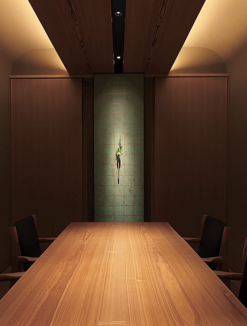 緑青の装飾パネルは戸袋を兼ね、木製パネルに麻布を全面に貼り、銅箔をグリッド状に丁寧に上張りし、さらに緑青を吹かせてアクリル塗料でコーティングしています。和室の趣に、戸袋が襖絵のような効果をもたらし落ち着いた装飾になっています。